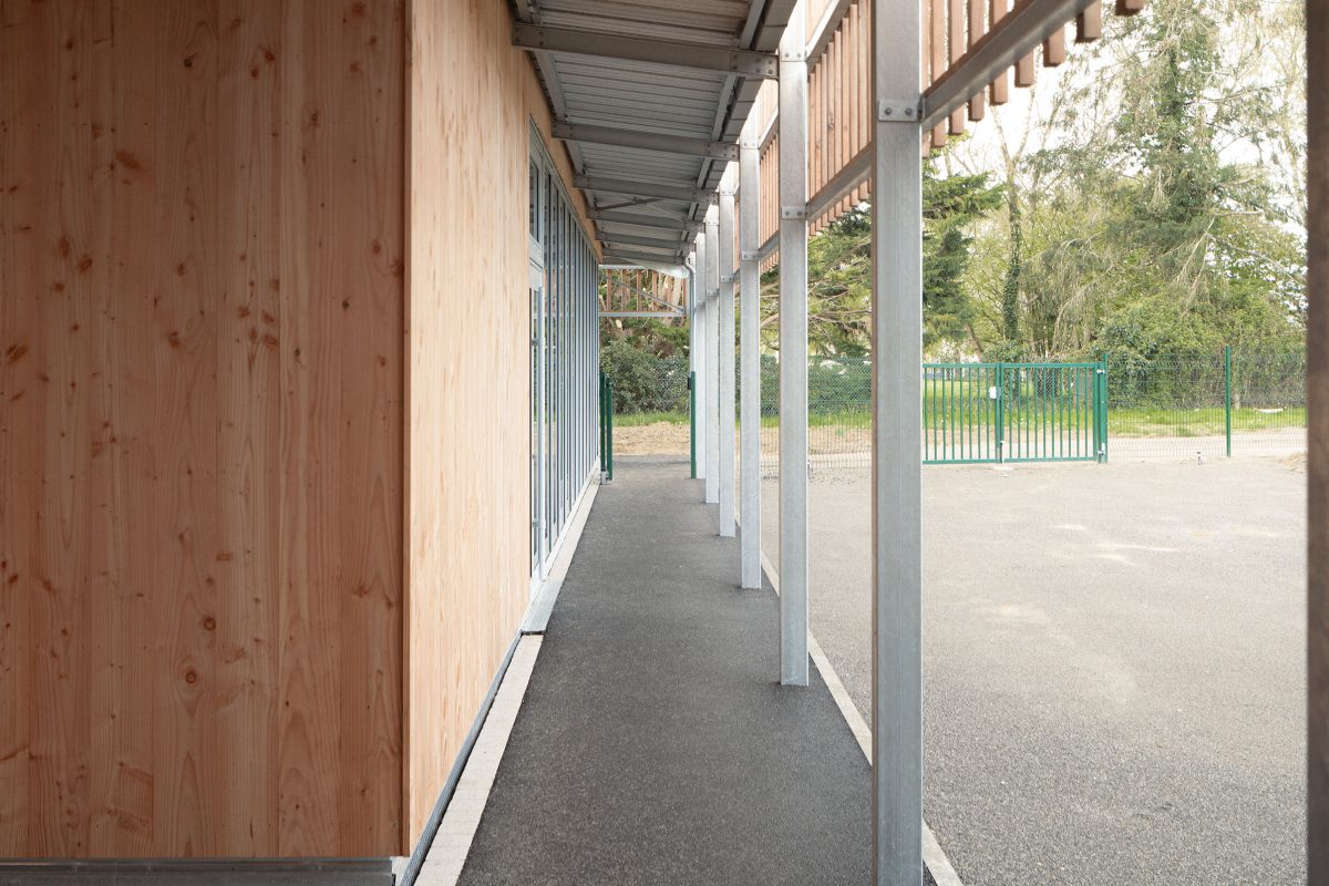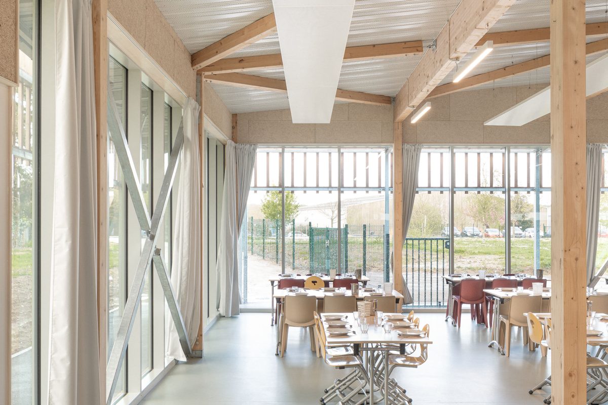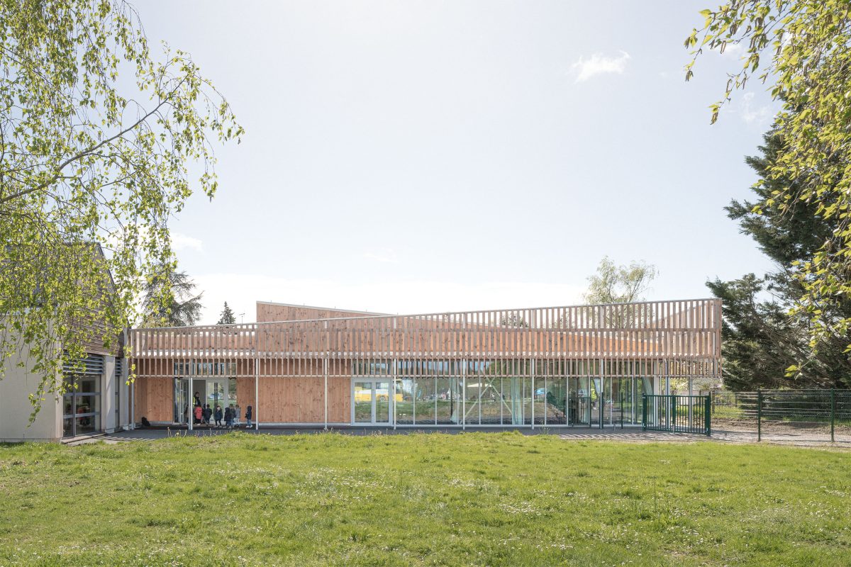 Cette évocation se traduit dans le dessin des façades, où le principe d’empilement devient un motif architectural, à la fois sensible et contemporain. Par ce travail sur la matière et la texture, le bâtiment dialogue avec son environnement tout en proposant une écriture singulière. L’extension affirme ainsi une identité douce et protectrice, adaptée aux jeunes usagers, tout en participant à une lecture renouvelée du site, entre mémoire locale et exigence architecturale actuelle.