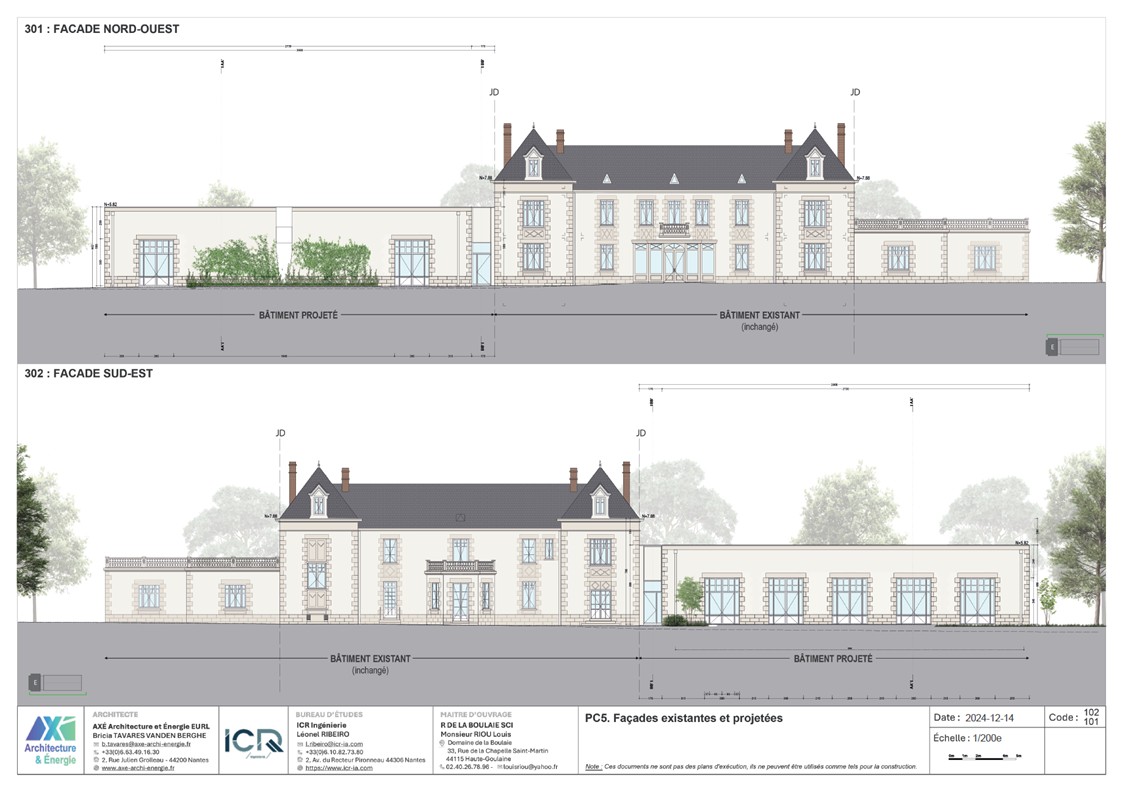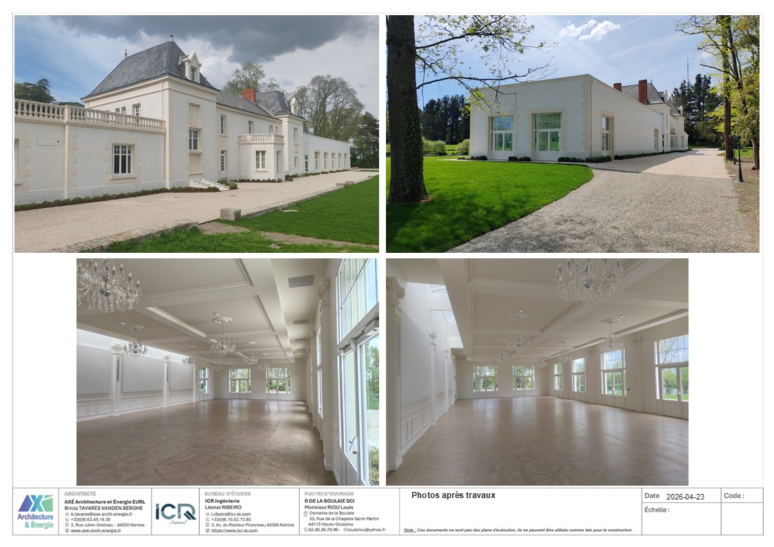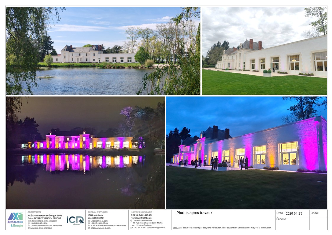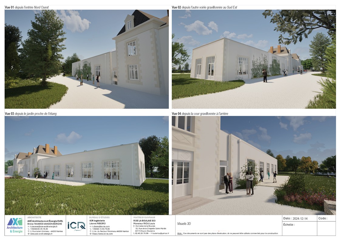 Le projet est un agrandissement du Manoir de la Boulaie afin de créer une salle de restauration pour accueillir moins de 200 personnes. Le bâtiment reprends la même écriture de façade que le Manoir. Il est composé d'un SAS tampon entre l'existant et le nouveau afin d'améliorer les performances thermiques et acoustiques. Le projet est parfaitement dissocié de l'existant (équipement techniques, réseaux, architecture). Aucune intervention n'est prévue dans l'existant.