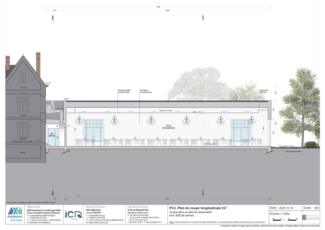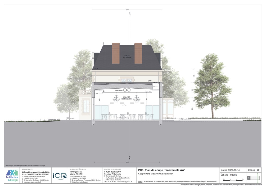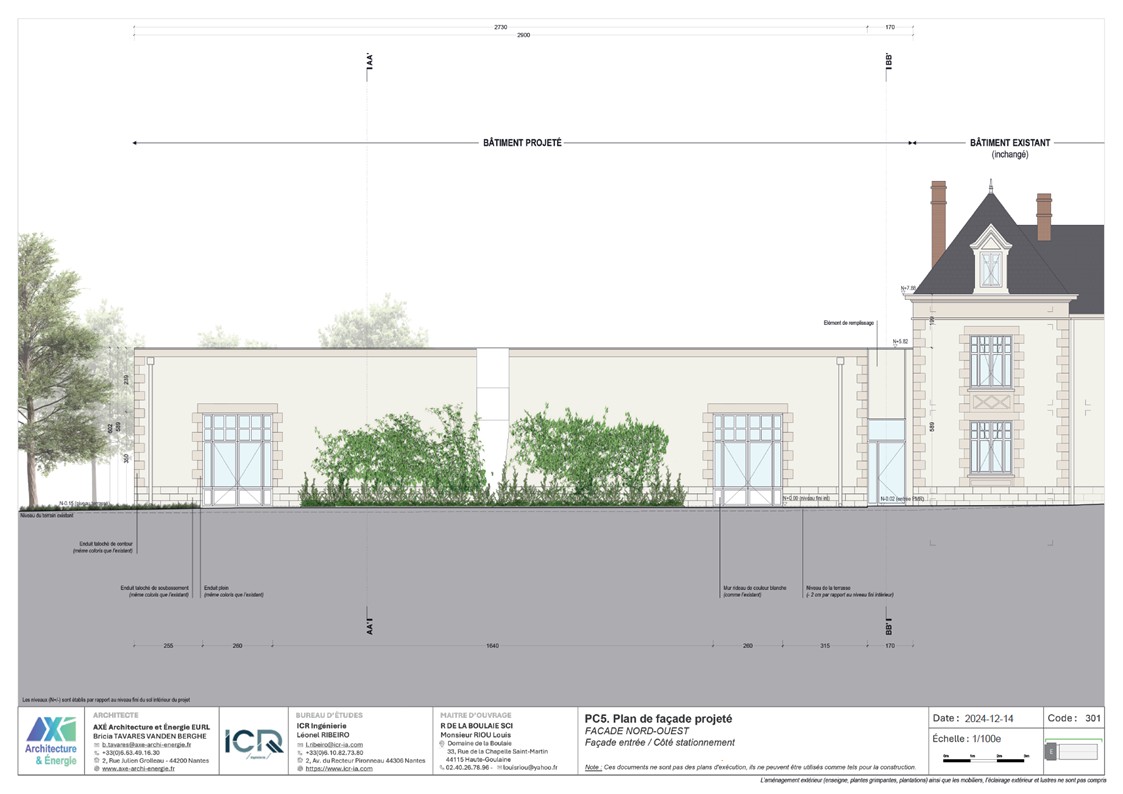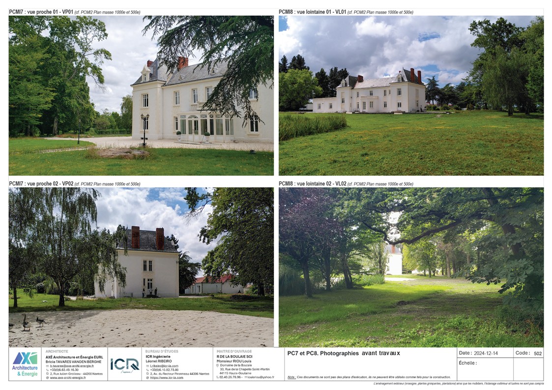 Le projet est un agrandissement du Manoir de la Boulaie afin de créer une salle de restauration pour accueillir moins de 200 personnes. Le bâtiment reprends la même écriture de façade que le Manoir. Il est composé d'un SAS tampon entre l'existant et le nouveau afin d'améliorer les performances thermiques et acoustiques. Le projet est parfaitement dissocié de l'existant (équipement techniques, réseaux, architecture). Aucune intervention n'est prévue dans l'existant.
