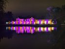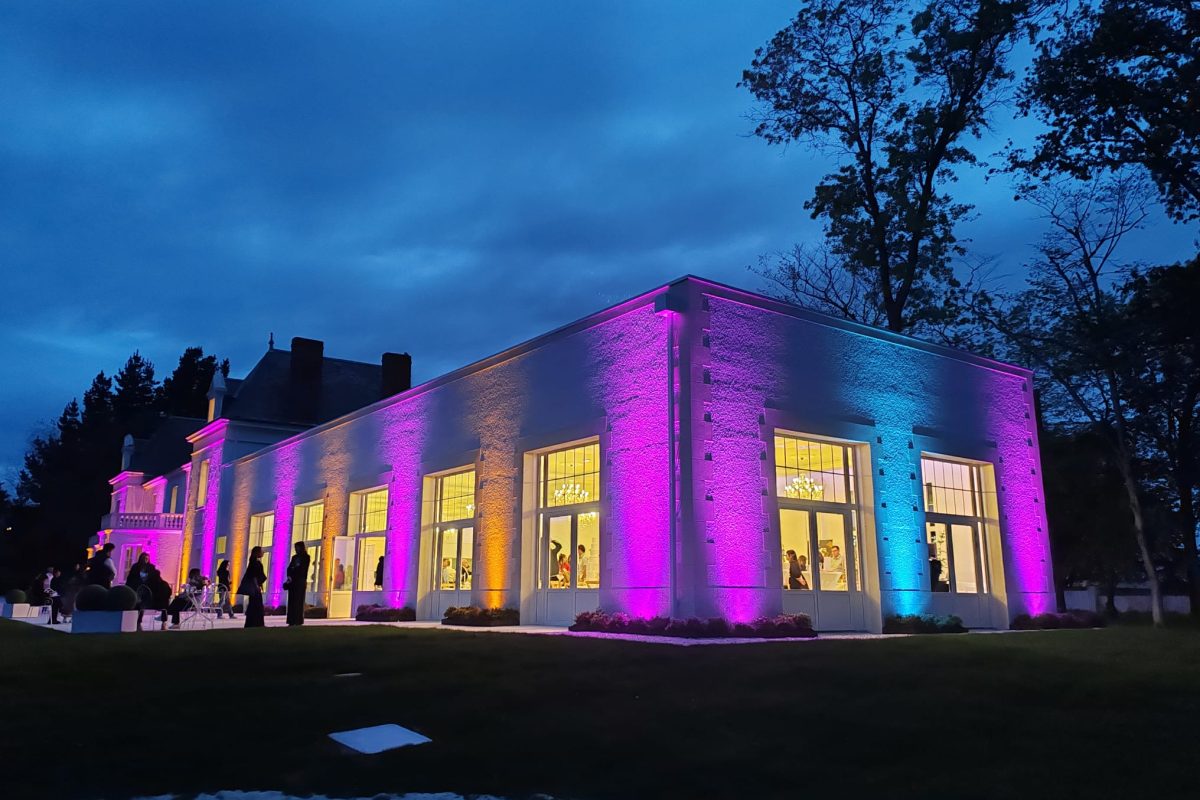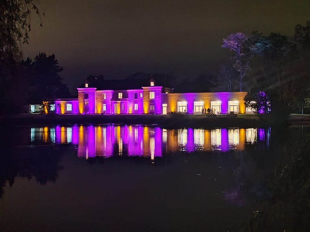L’effet est immédiat dès que l’on pénètre dans l’extension : une sensation d’espace, de lumière et d’ouverture qui saisit le visiteur. Le puits de lumière zénithal inonde le volume intérieur d’une clarté généreuse, que viennent amplifier les grandes baies vitrées offrant des vues continues sur le parc verdoyant et l’étang. Les moulures et le travail de plafond rappellent le soin apporté à l’architecture d’apparat du manoir, tandis que la pénétration de la lumière naturelle crée des jeux d’ombres et de reflets qui animent les espaces au fil de la journée. C’est une architecture qui ose (qui fait le choix de l’audace là où la prudence aurait pu l’emporter) et c’est précisément cette audace qui produit cet effet de surprise et d’émerveillement dès le premier regard.