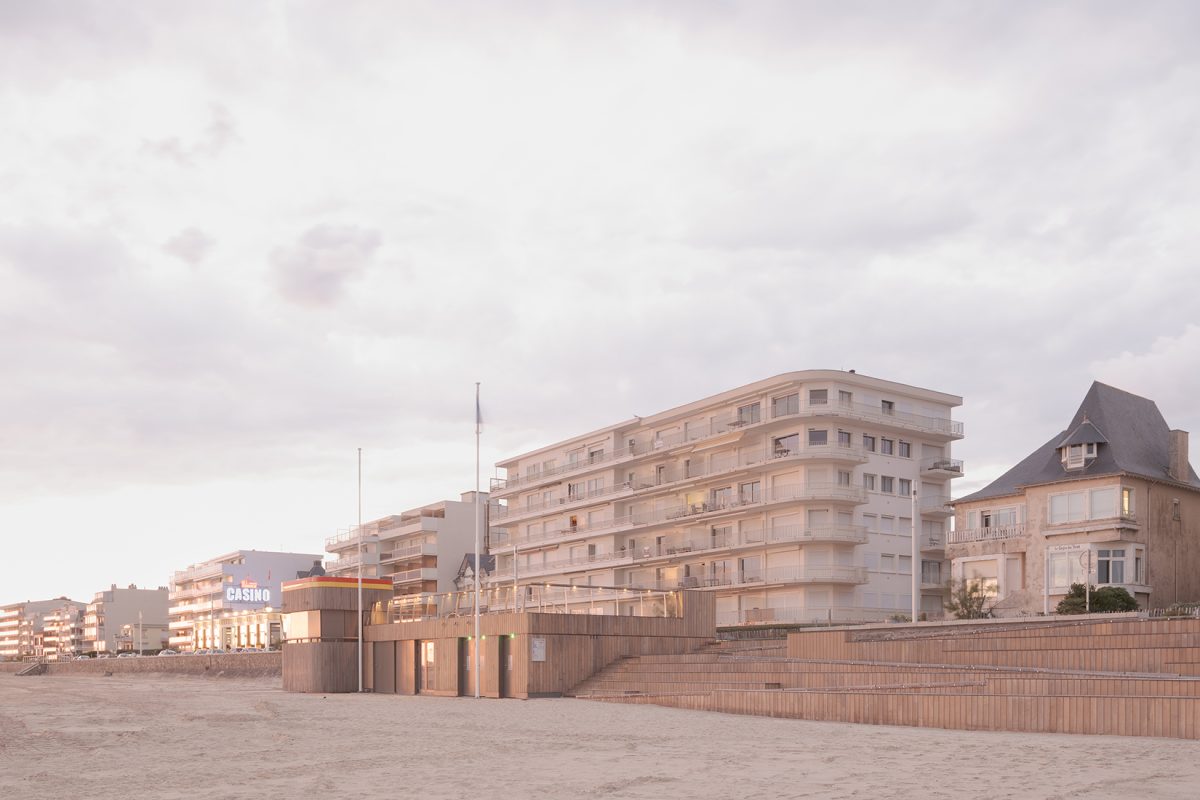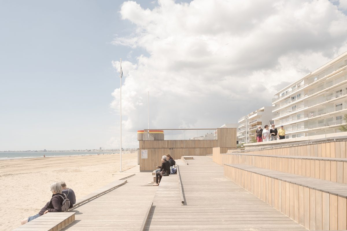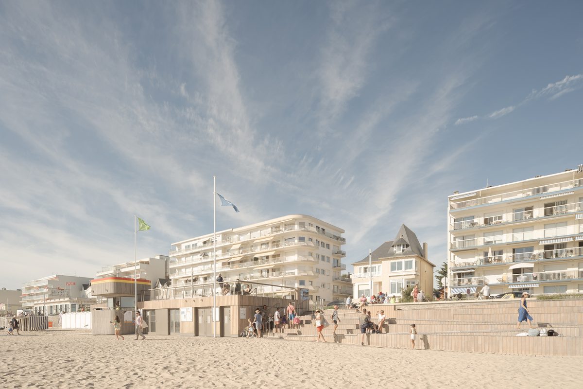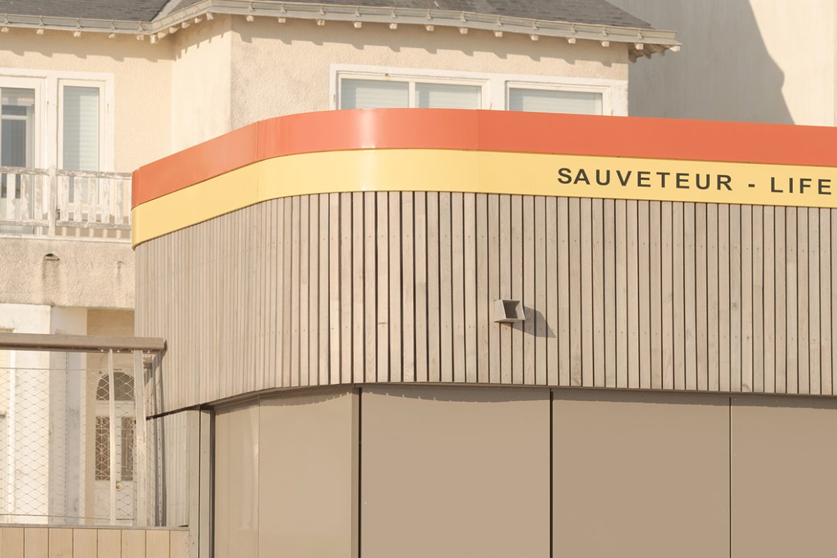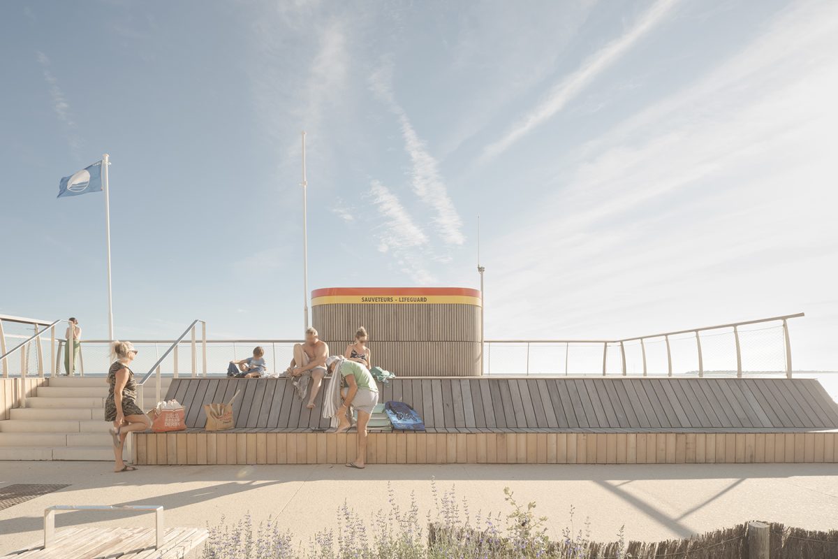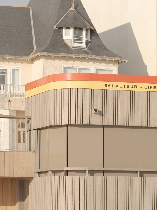 bord de mer. Les terrasses en lien avec le remblai sont retravaillé et agrandi pour affirmer la dimension de belvédère sur l’Océan Atlantique. La vigie des secouristes ressort du volume pour accentuer sa reconnaissance de loin en contraste avec le bardage bois teinte sable du reste du corps bâti.
