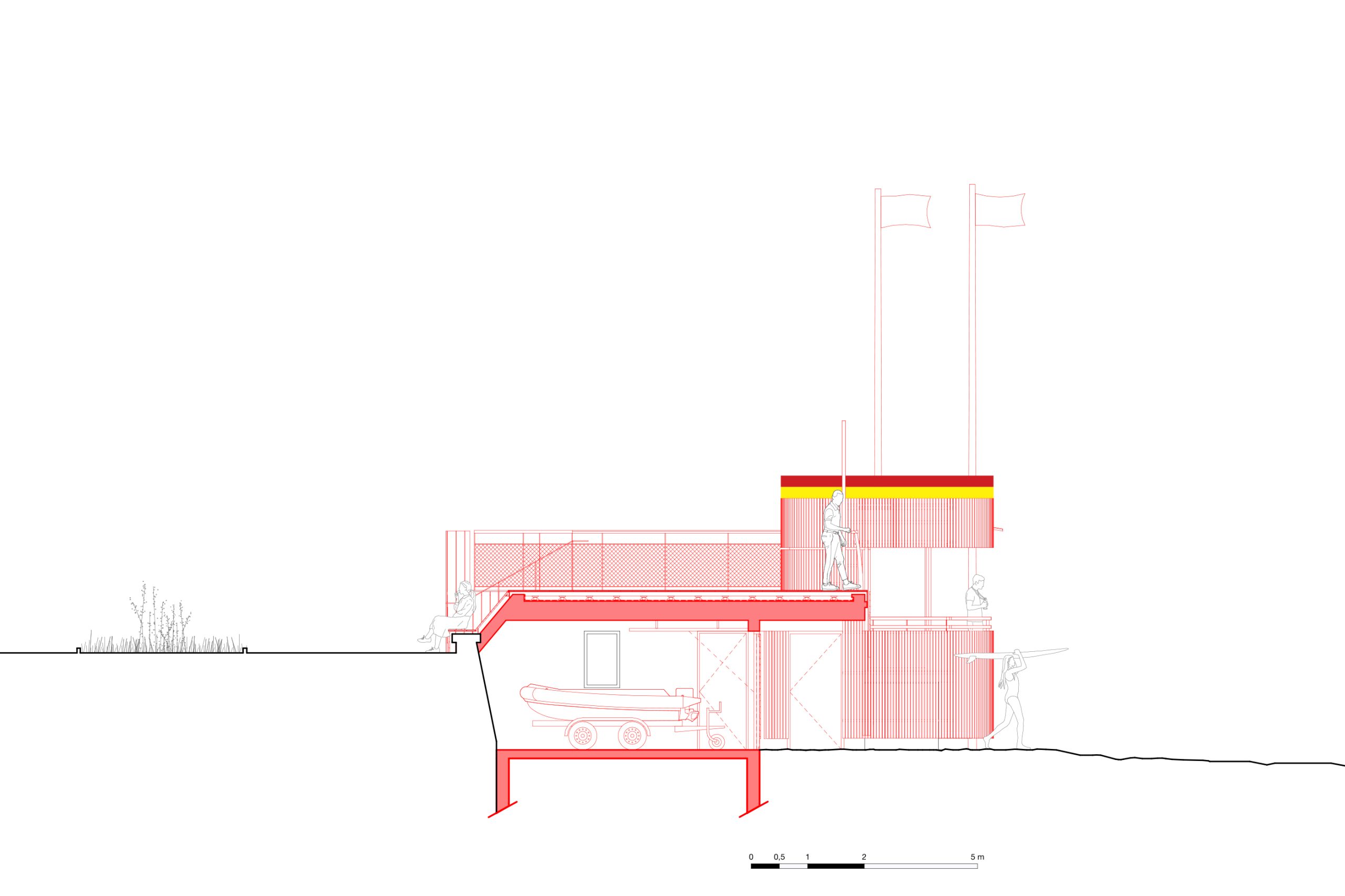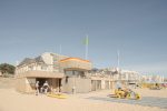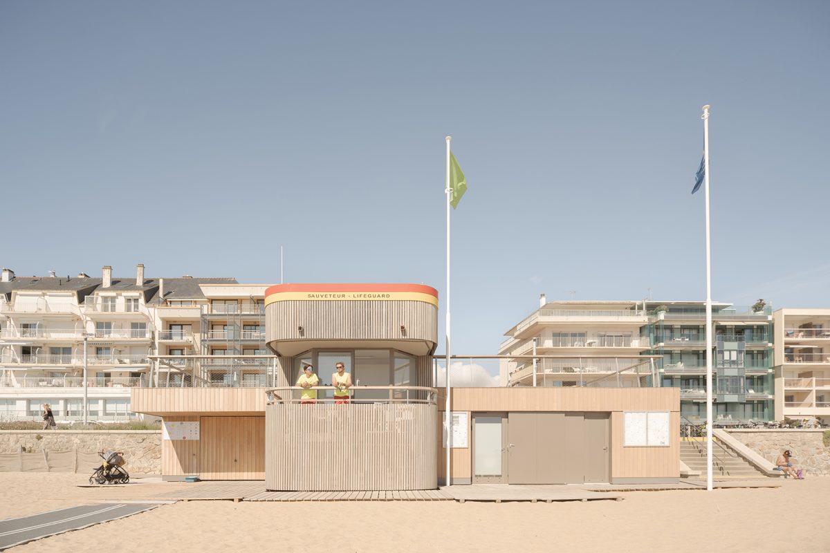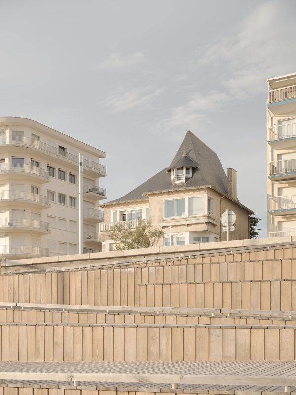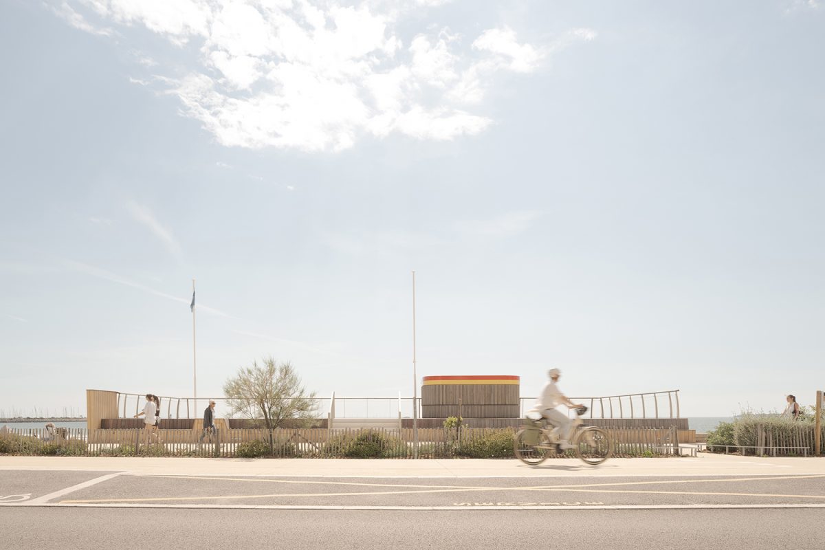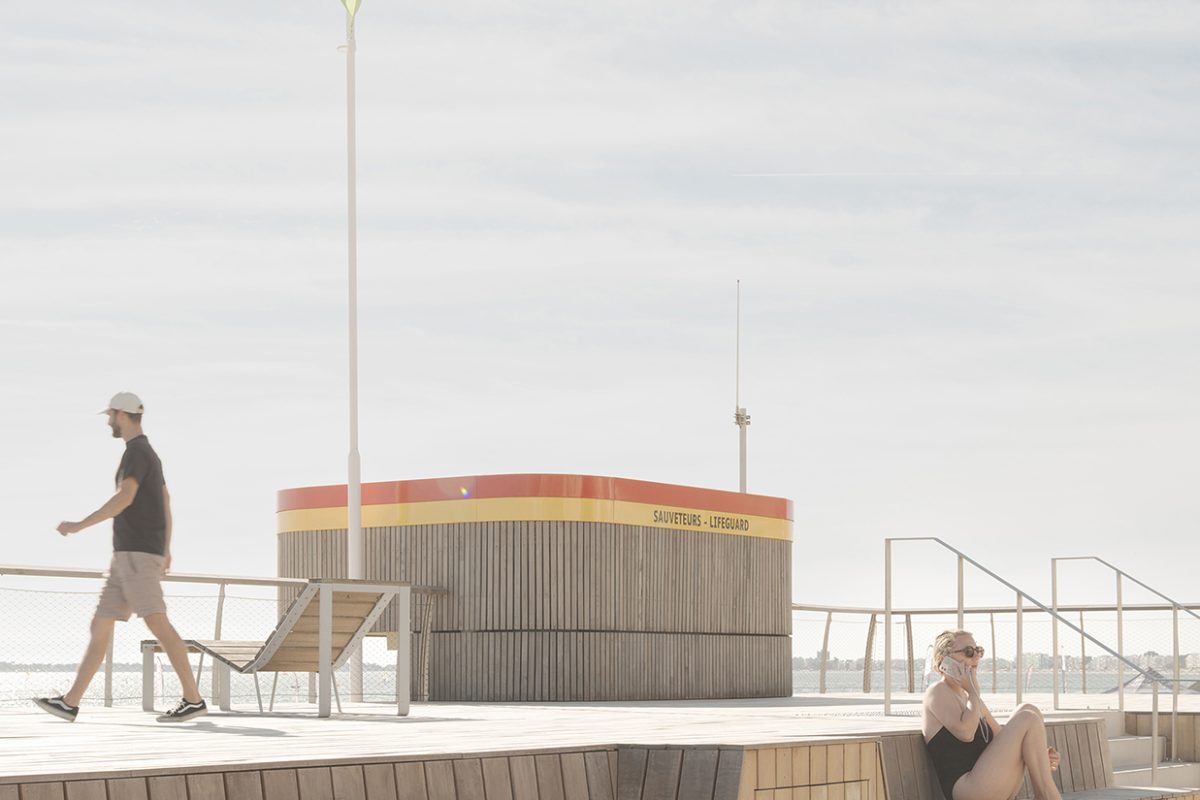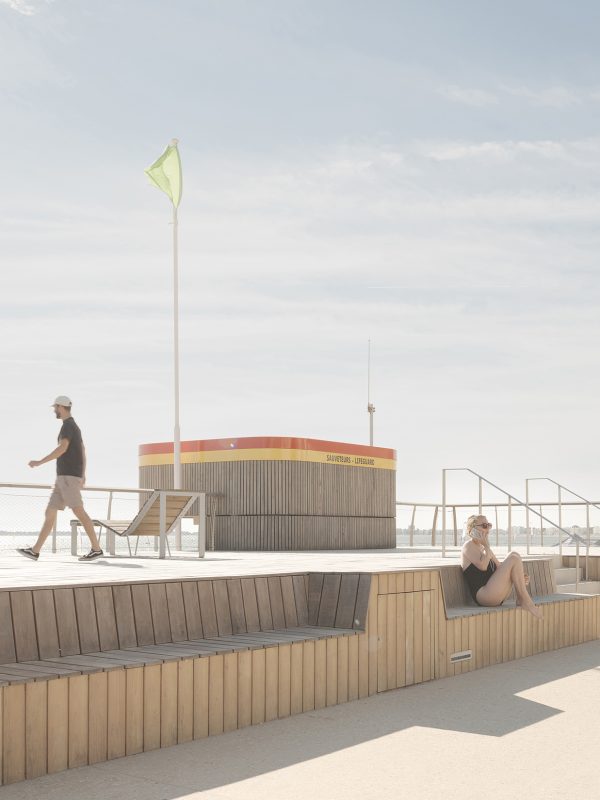 bord de mer. Les terrasses en lien avec le remblai sont retravaillé et agrandi pour affirmer la dimension de belvédère sur l’Océan Atlantique. La vigie des secouristes ressort du volume pour accentuer sa reconnaissance de loin en contraste avec le bardage bois teinte sable du reste du corps bâti.