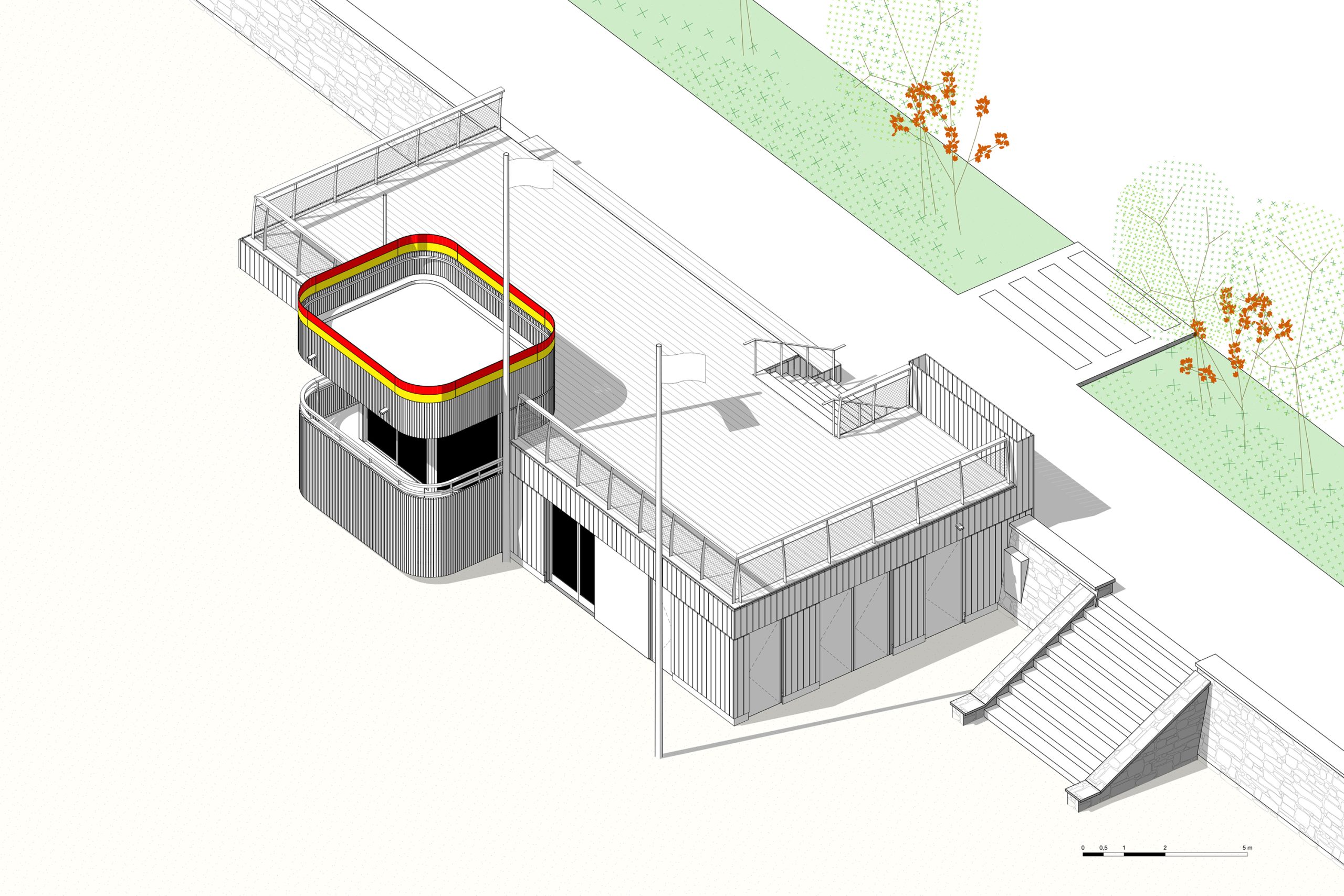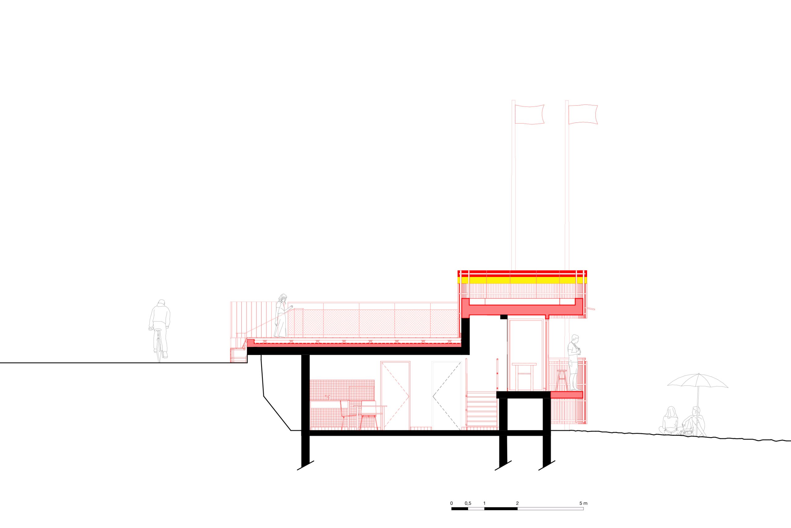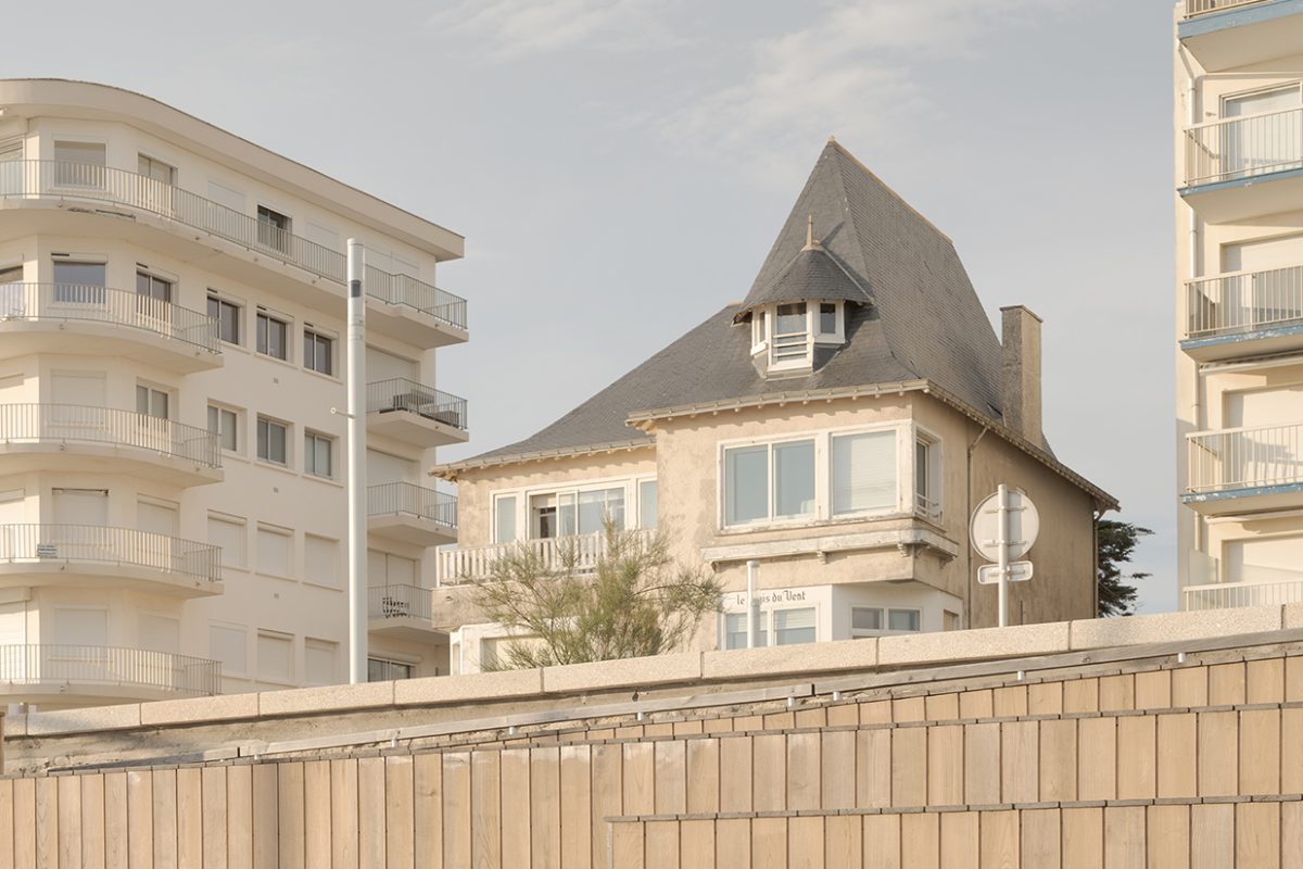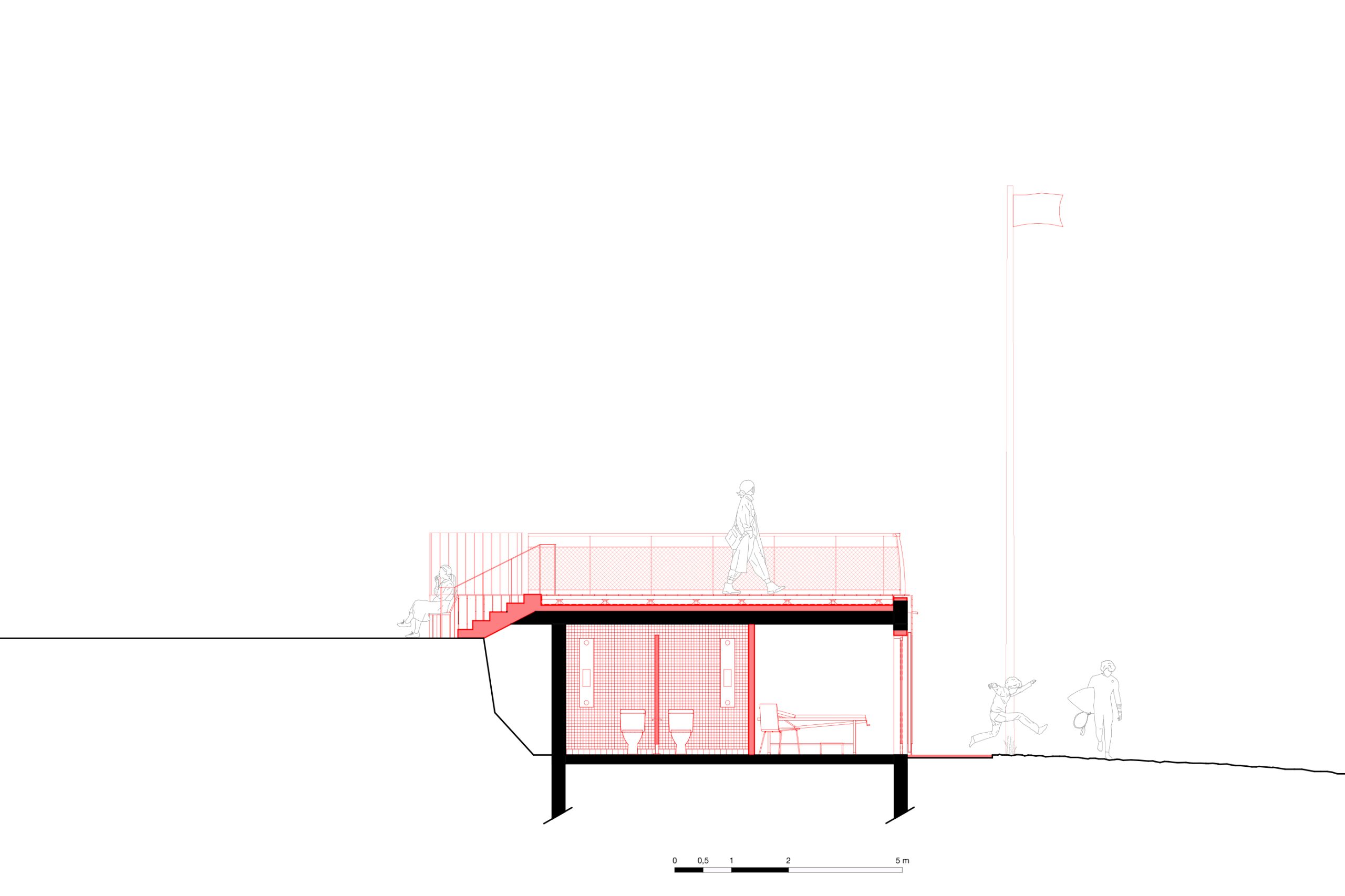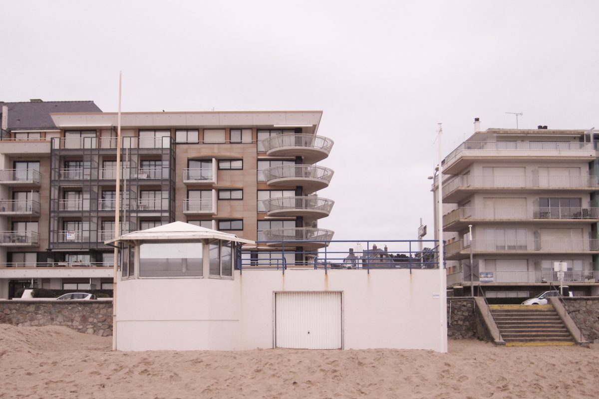 bord de mer. Les terrasses en lien avec le remblai sont retravaillé et agrandi pour affirmer la dimension de belvédère sur l’Océan Atlantique. La vigie des secouristes ressort du volume pour accentuer sa reconnaissance de loin en contraste avec le bardage bois teinte sable du reste du corps bâti.