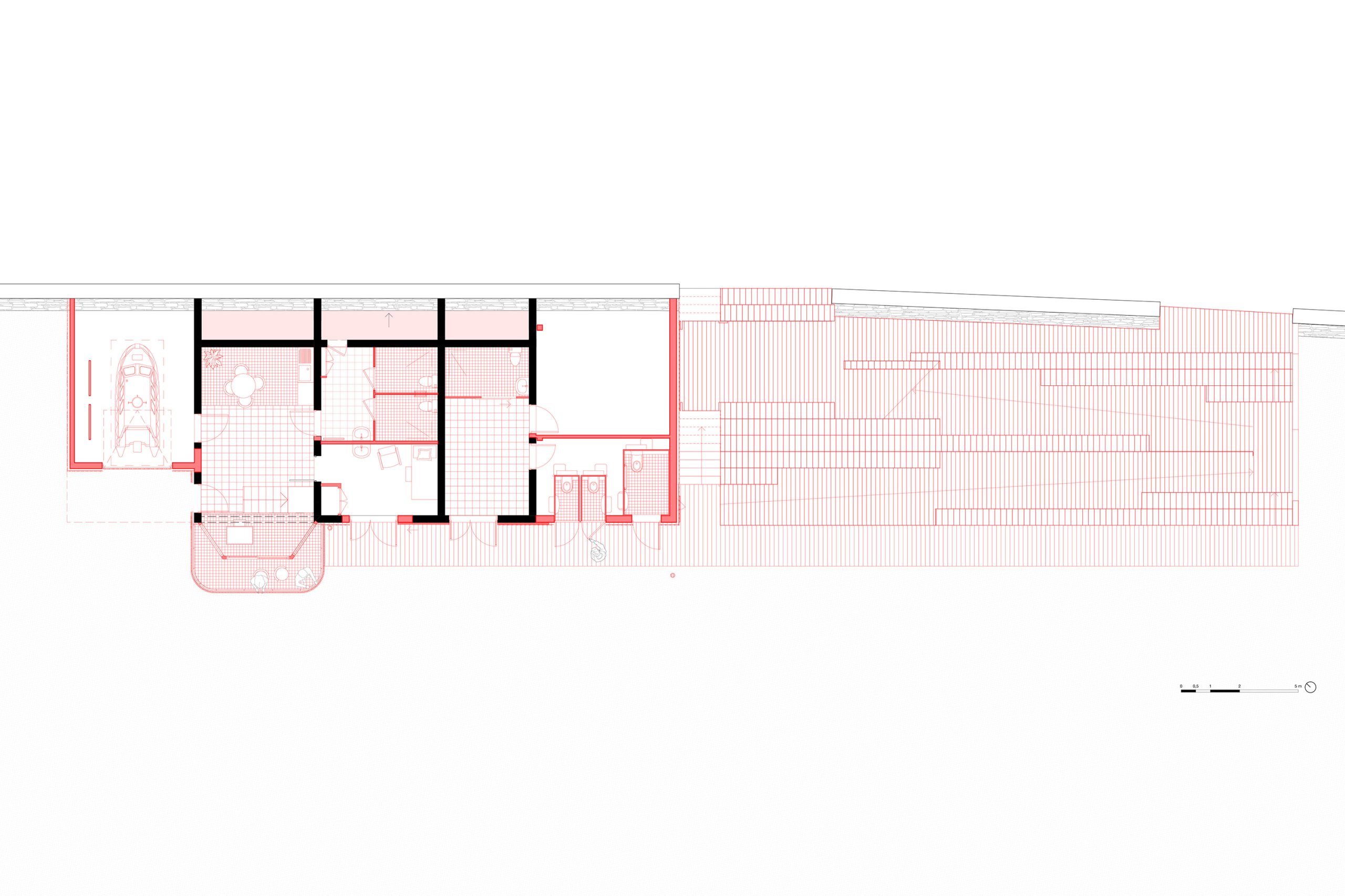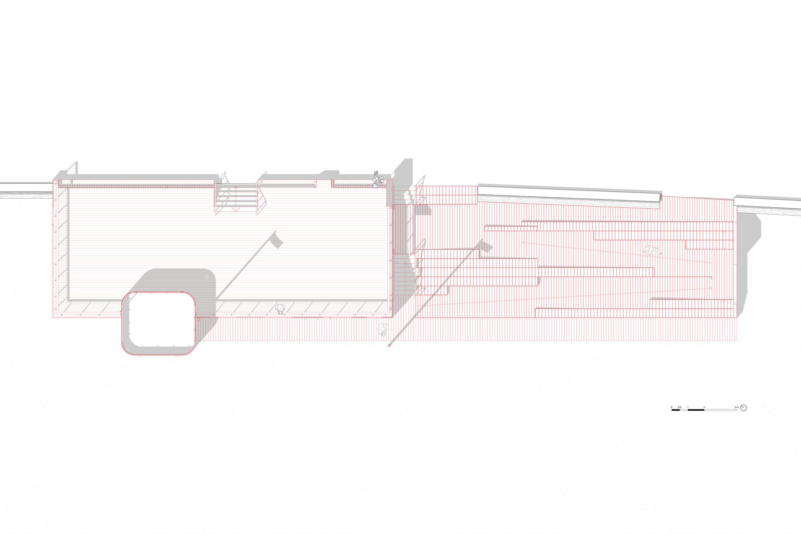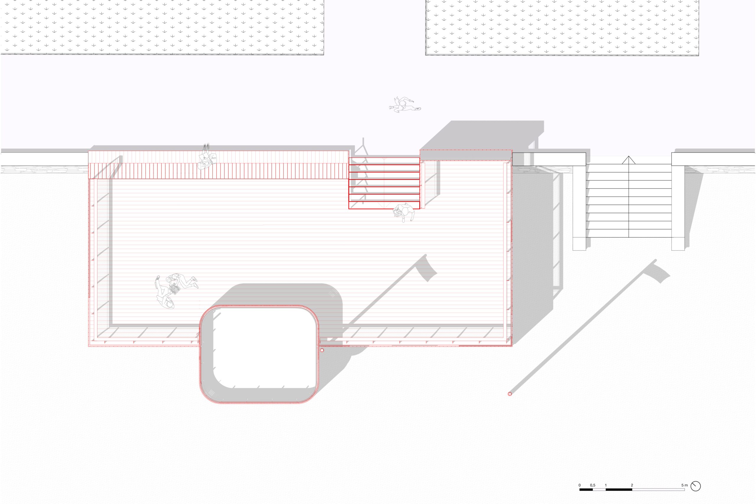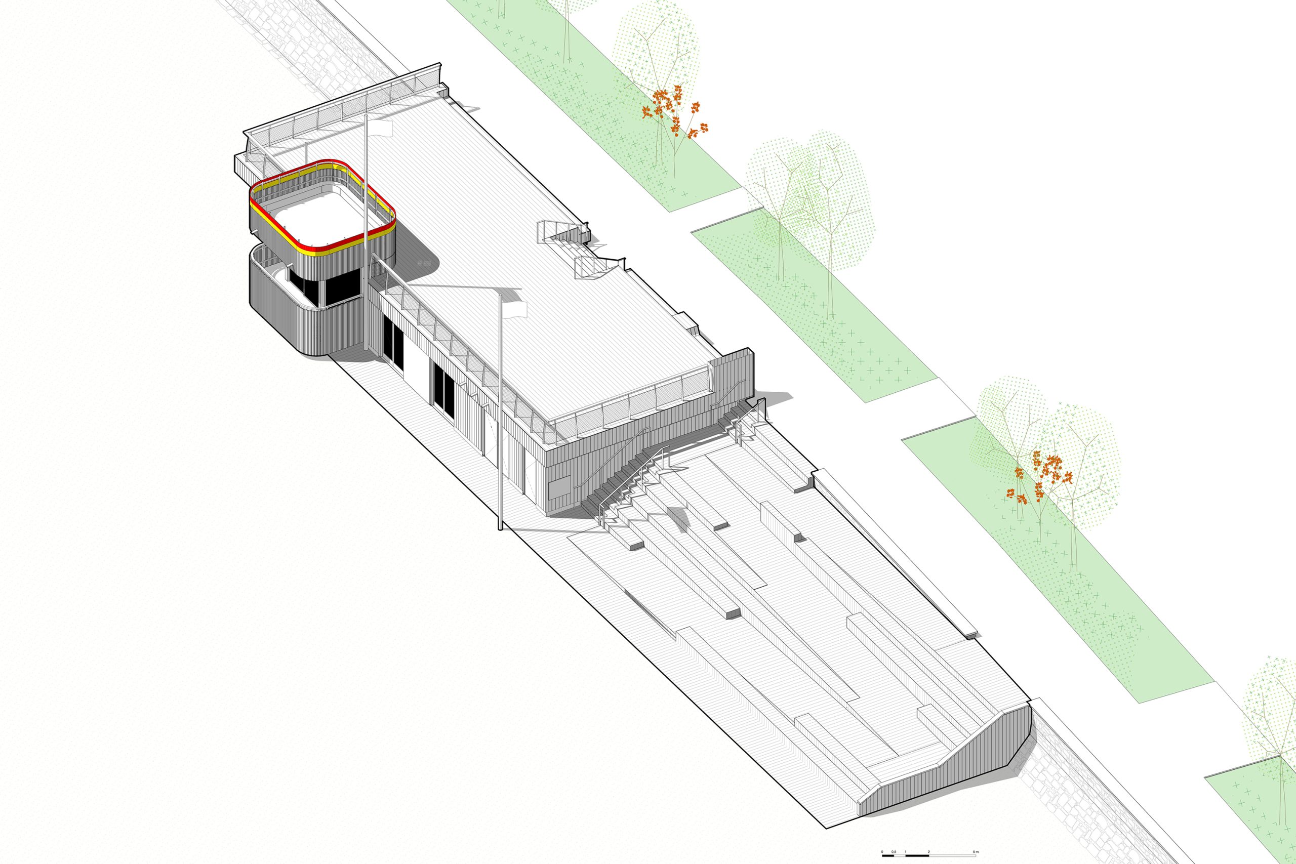 bord de mer. Les terrasses en lien avec le remblai sont retravaillé et agrandi pour affirmer la dimension de belvédère sur l’Océan Atlantique. La vigie des secouristes ressort du volume pour accentuer sa reconnaissance de loin en contraste avec le bardage bois teinte sable du reste du corps bâti.